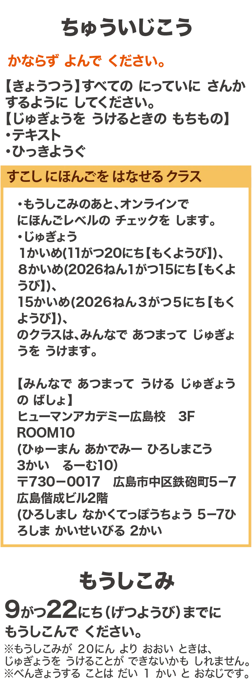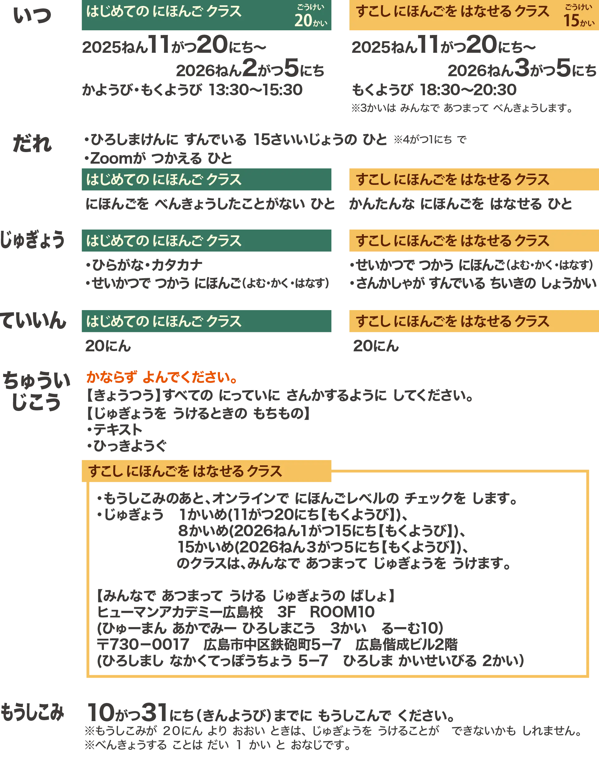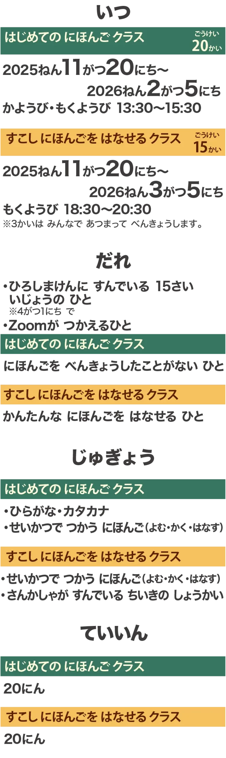 「日本語にほんごを初はじめて学まなぶ外国人がいこくじん」や「近ちかくに日本語にほんご教室きょうしつがない広島県内ひろしまけんないに住すんでいる外国人がいこくじん」を対象たいしょうにしています。生活せいかつをするなかで必要ひつような日本語にほんごを学まなんで、地域ちいきとのコミュニケーションや地域ちいきへの活動かつどうができるようにします。