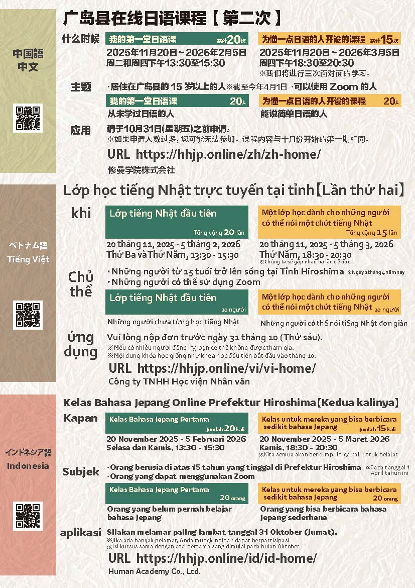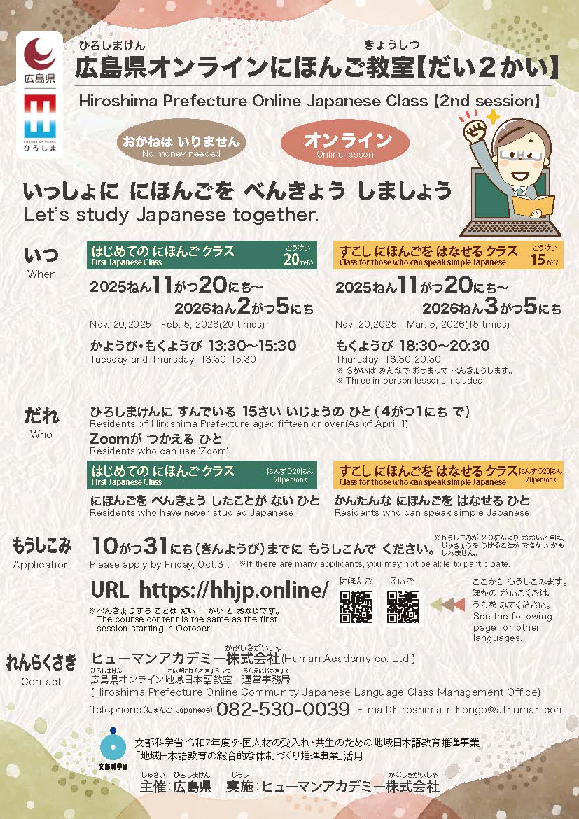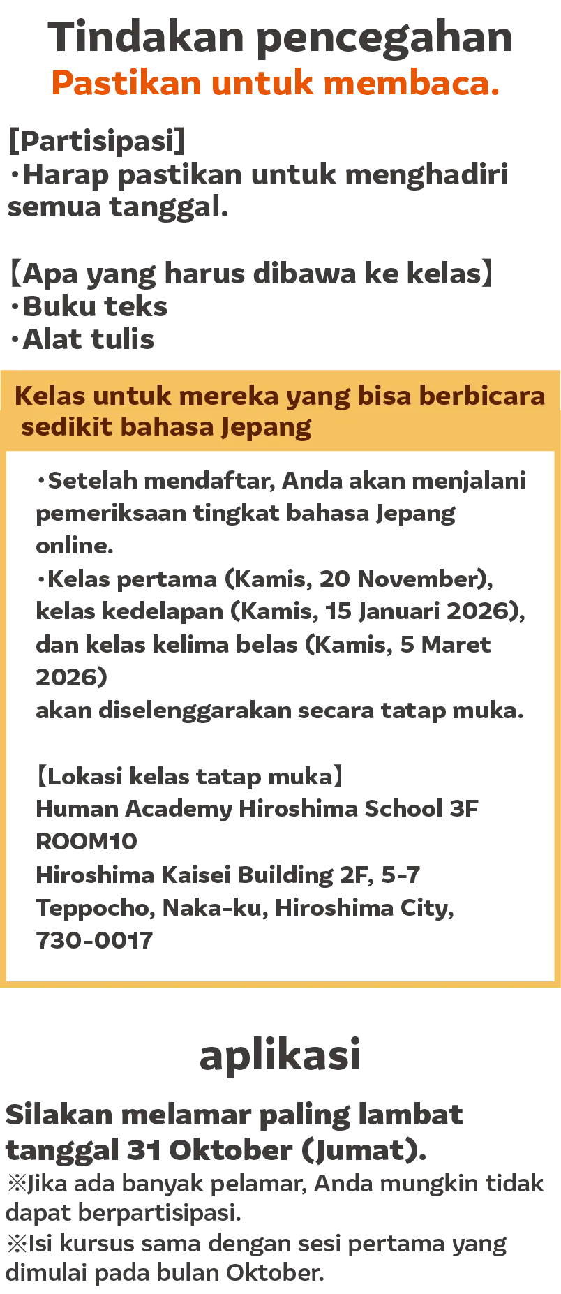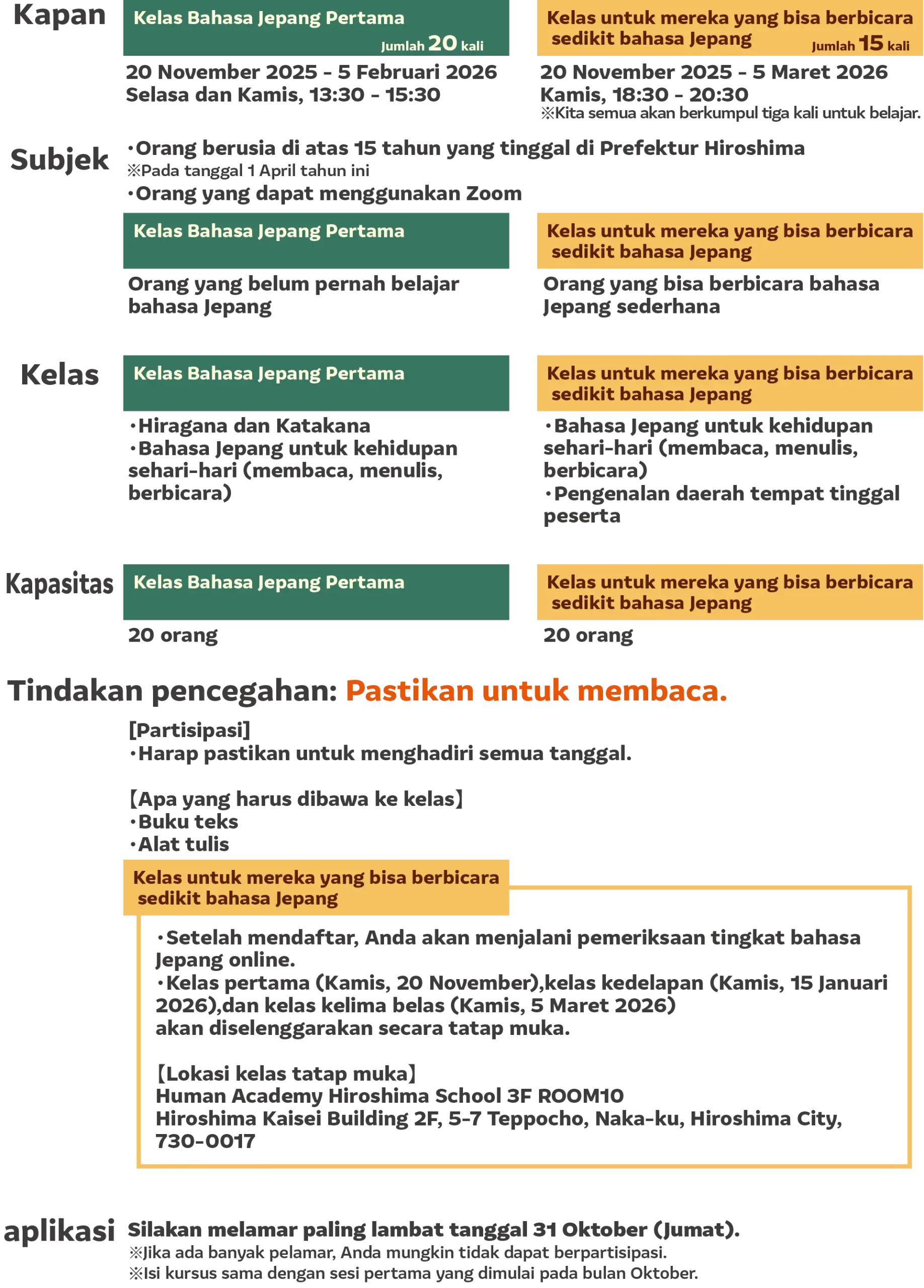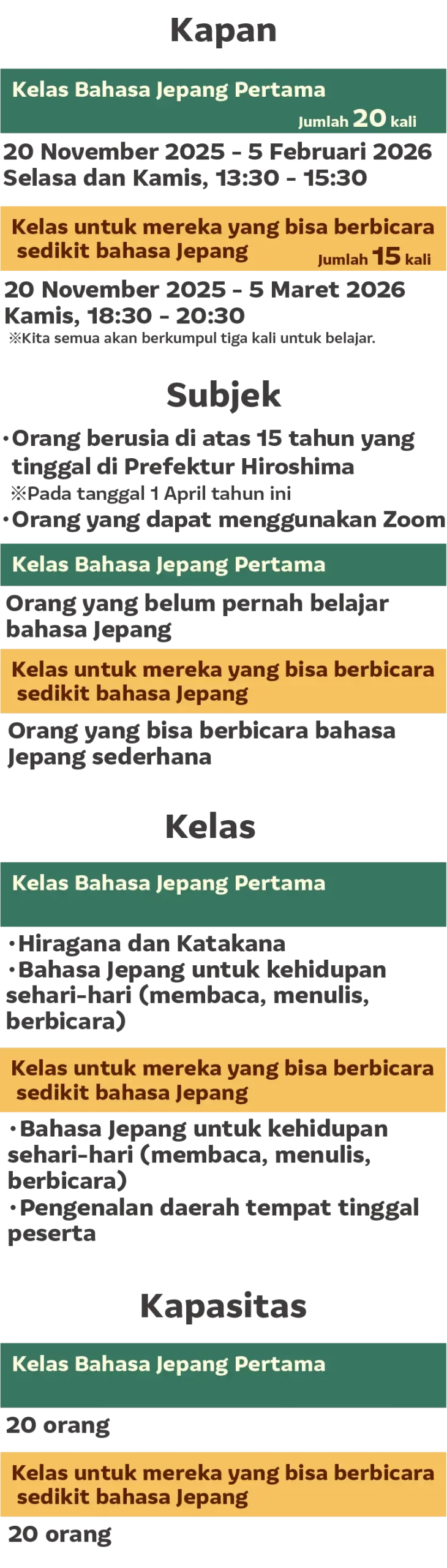Program ini ditujukan bagi warga negara asing yang sedang belajar bahasa Jepang untuk pertama kalinya, atau warga negara asing yang tinggal di Prefektur Hiroshima dan tidak memiliki kelas bahasa Jepang di sekitarnya. Program ini memungkinkan mereka untuk mempelajari bahasa Jepang yang diperlukan dalam kehidupan sehari-hari, memudahkan komunikasi dengan masyarakat setempat, dan partisipasi dalam kegiatan komunitas.